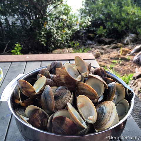 Our second night we bought a sack of 100 clams and Deas cooked them for us behind our RV. We had one of the waterfront sites, but due to trees we only had a little peak at the water. But the clams were sooo good, and aftewards Denny & Veronica joined us for some wine.